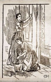 Un zócalo de azulejos azules y blancos rodeaba todo el patio y ¡cómo brillaban!, gracias al duro trabajo de las dos señoritas que estaban «dale que te pego» con unos cepillos y jabón. Giré sobre mis pasos, al escuchar un ruido. La misma niña de antes volvía a salir de su habitación, esta vez junto a la mujer, que llevaba un candil y desapareció al fondo del pasillo. ¿cómo de grande sería aquella casa? ¡Al menos tenía 10 habitaciones! y solamente la parte que yo había visto. Seguí a la niña, que saltando dejaba volar los volantes de su rico vestido. Se paró frente a una puerta, se atusó el pelo y llamó con delicadeza. Desde dentro, una voz de mujer dijo: «Adelante». La niña abrió la puerta y vi la escena.